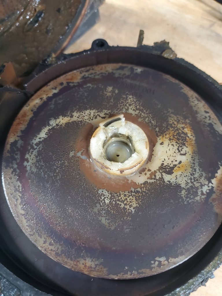 White residue and corrosion around the central cavity suggest water intrusion past the seal—likely a failed shaft seal or gasket.