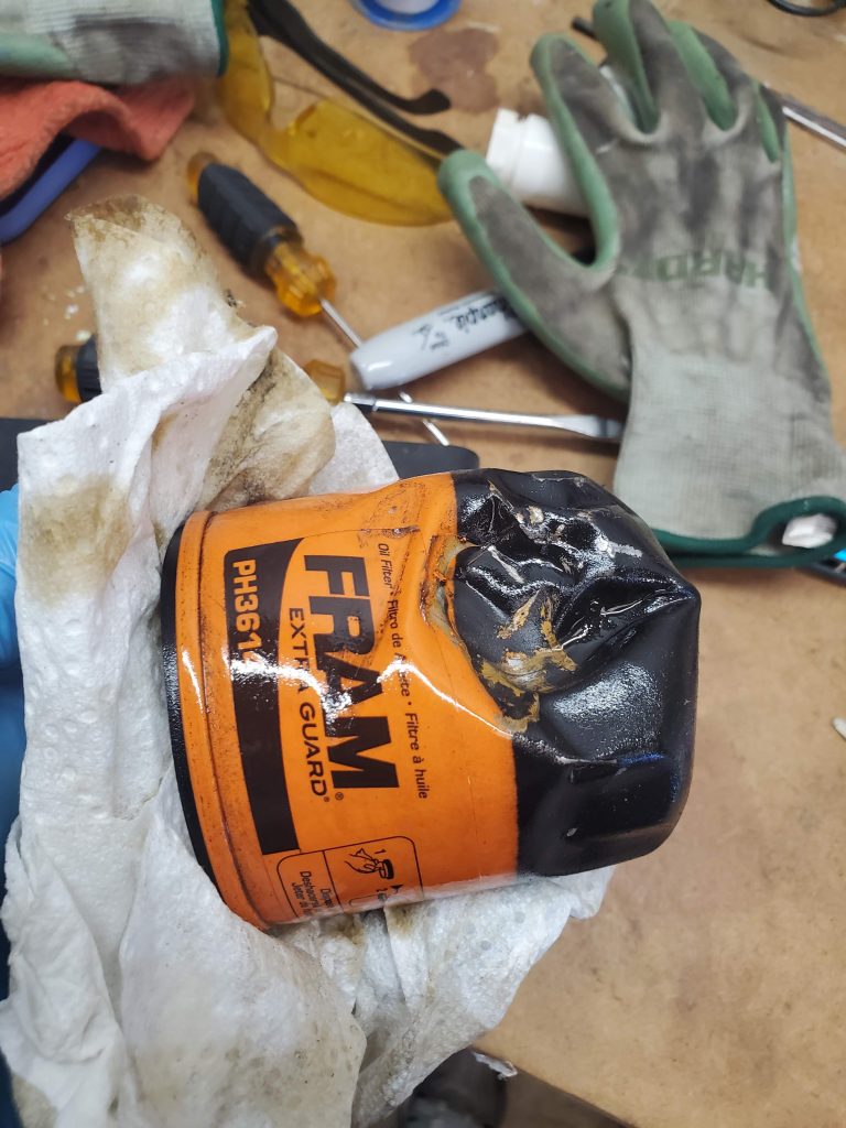 The tire debris must have caught the bottom of the radiator and radiator mounts because the radiator, condenser and the radiator mount bracket were bent. The radiator mount bracket was bent over 90 degrees on one side. There was so much force that a bolt on the mounting bracket was pushed into the oil filter with enough force to crush the filter.